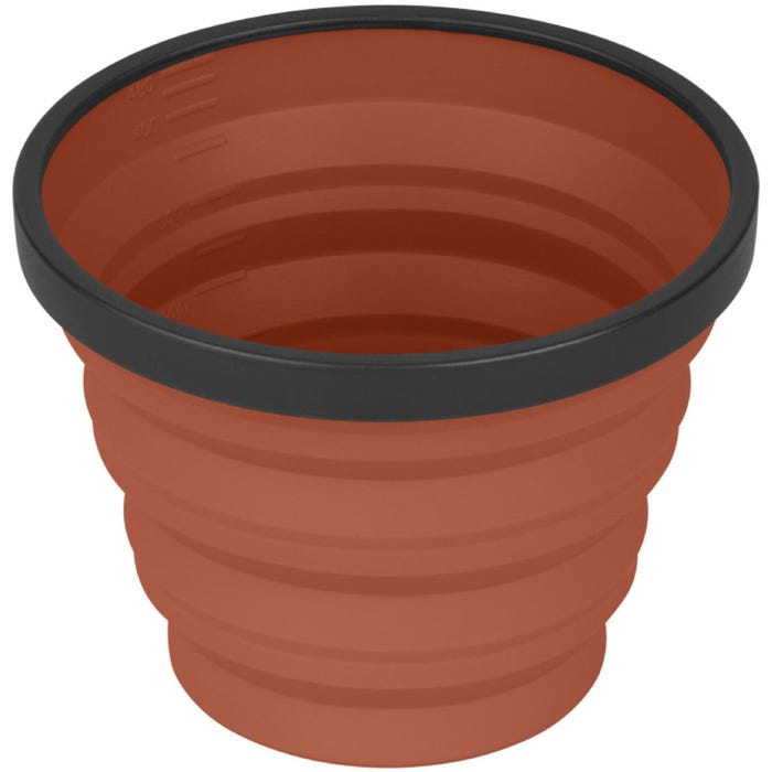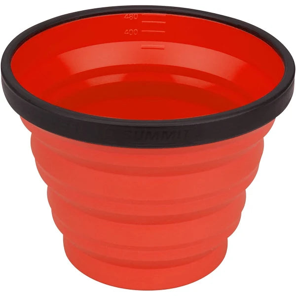 The X-Mug is a collapsible mug that is also calibrated as a measuring cup. The flexible silicone sides collapse making this a small compact disc sized dinnerware piece that nests neatly with other X-Series dinnerware and X-Pots.