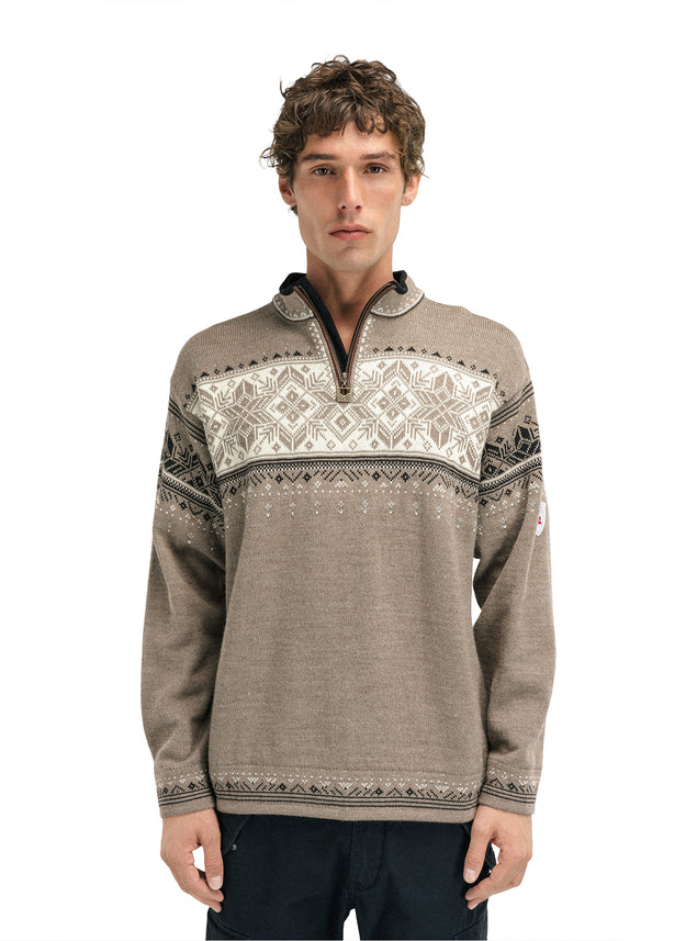 The Blyfjell is a best-selling men's sweater rooted in timeless Norwegian tradition. Made from 100% lightweight wool, it offers natural warmth and comfort while featuring a quarter-zip neckline with a fleece-lined collar for added softness. The intricate design showcases classic Norwegian folk patterns, including variations of the iconic eight-petal rose – a symbol of Norwegian heritage and artistry.