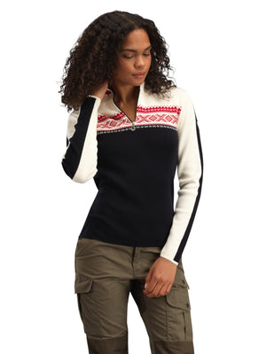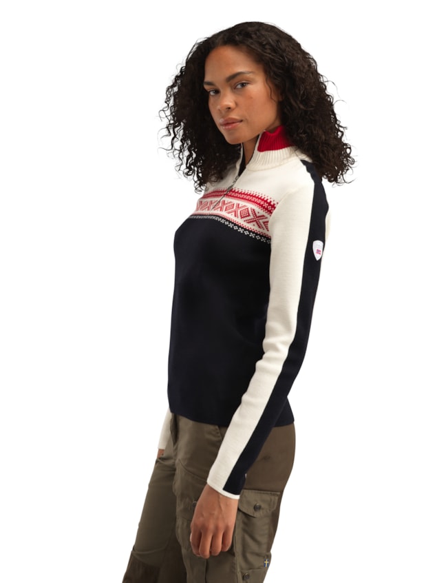 The Dystingen merino wool sweater is a sportier and lighter version of our classic Cortina 1956 sweater. Made of 100% skin soft merino wool, the block-colored Dystingen features an updated version of the Cortina pattern, and a contrast-colored high neck with a quarter zip.