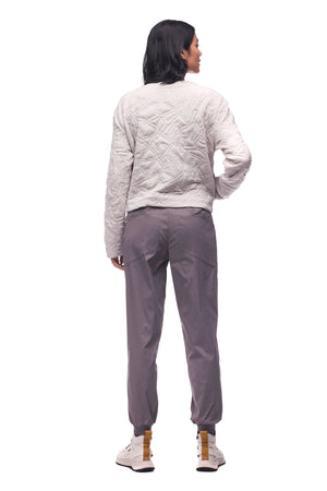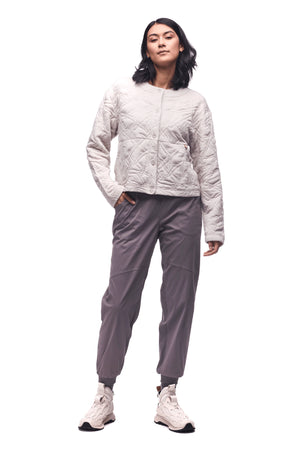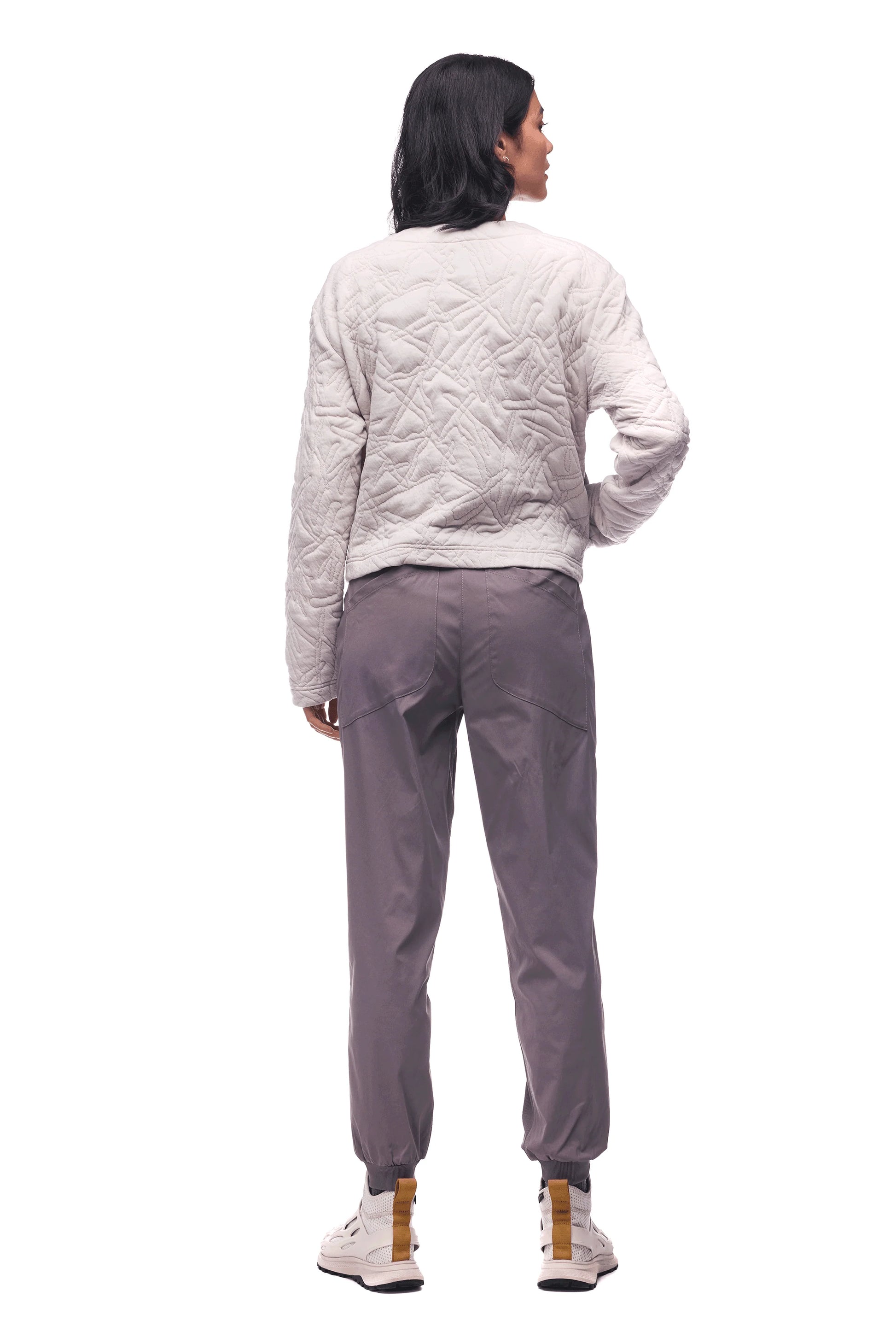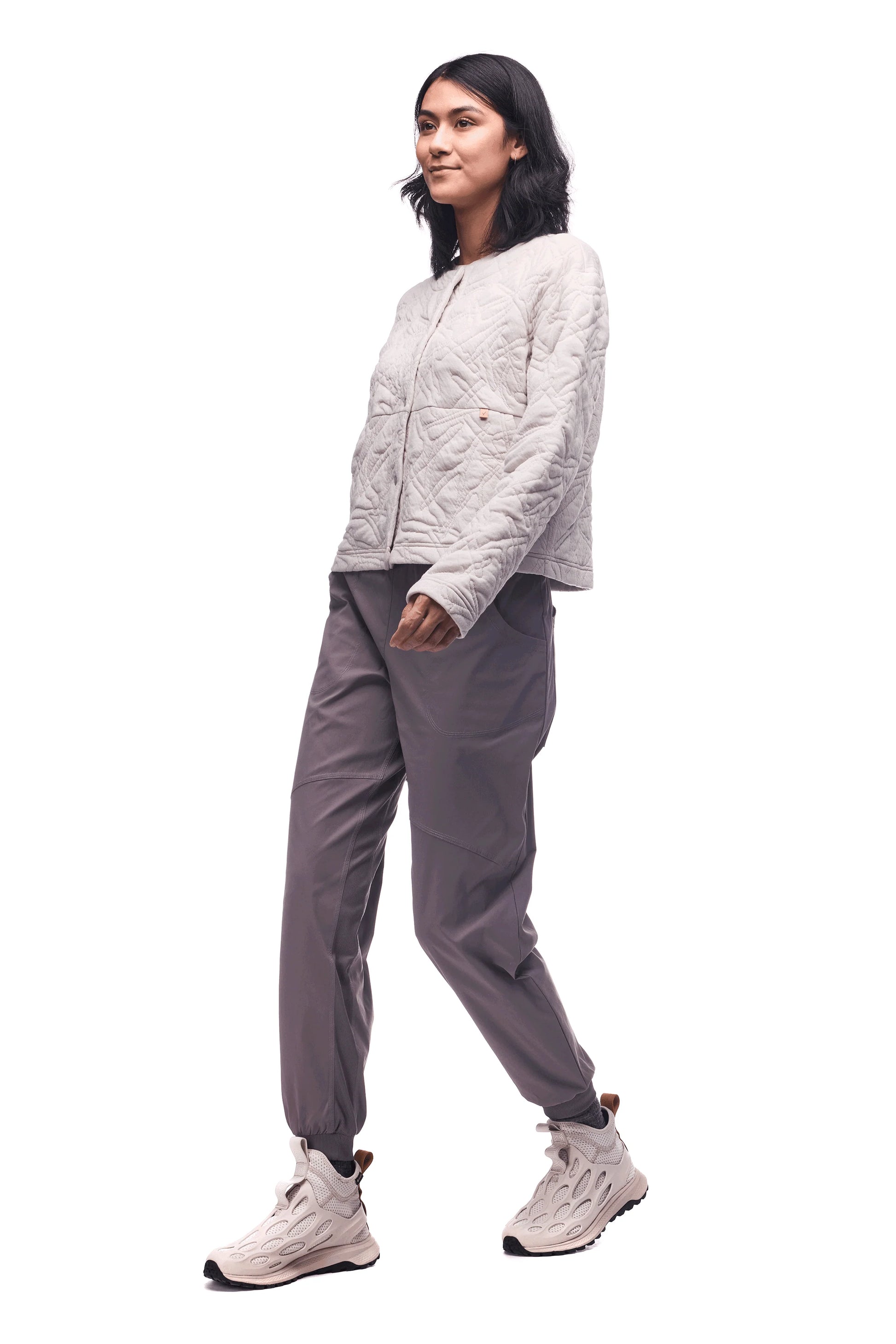 Short round-neck cardigan with snap buttons and Indyeva’s signature "Branches" quilted pattern. A bold, cozy twist on a classic silhouette.