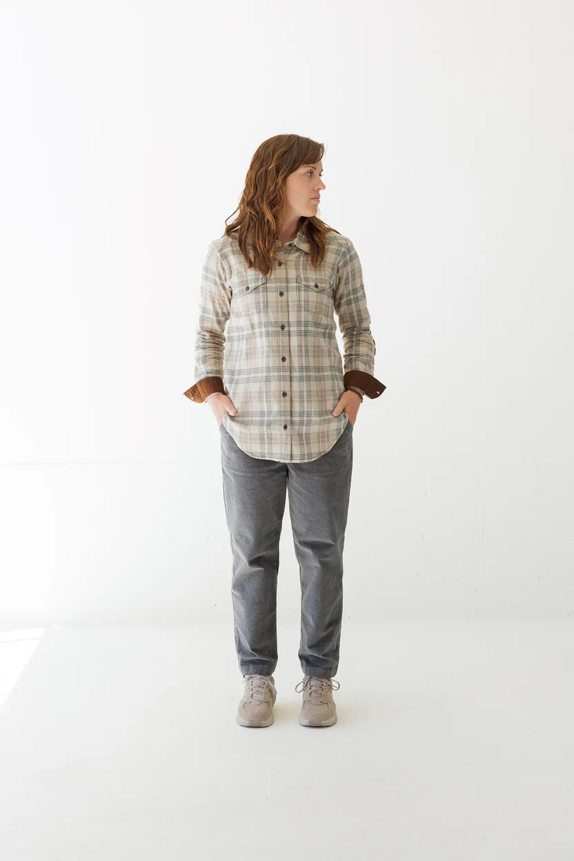 Boyfriend fit, long sleeve button up shirt, stand collar, two chest flap pockets, elbow patches, adjustable cuffs, 25% certified recycled polyester matte buttons, deep curved hem.