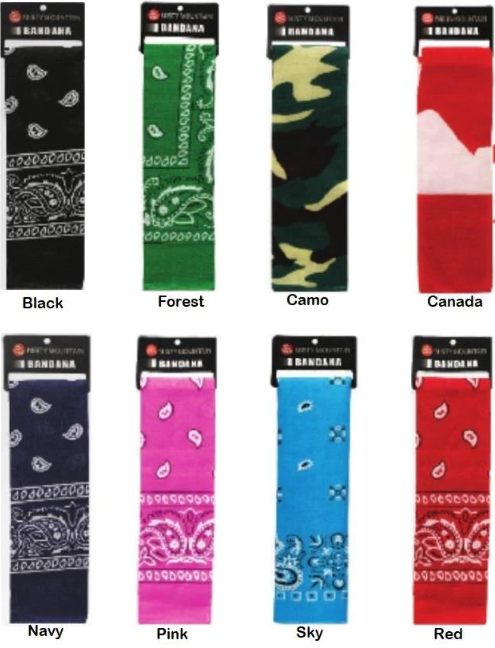 These lightweight cotton bandanas measure 21" square, are soft and machine washable.