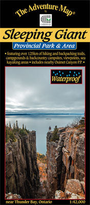 A large, medium-scale (1:42,000) waterproof map of the entirety of Sleeping Giant Provincial Park and surroundings that is perfect for planning your trip, and guiding you on the ground, or waters, of this northwestern Ontario Park just east of Thunder Bay. With over 125km of trails, including to the top of the iconic "Sleeping Giant" set of mesas, there is plenty to discover including a car campground and a number of backcountry tenting sites in 7 separate areas scattered around the Park. Lake Superior, which surrounds the peninsula, also provides plenty of shoreline and numerous islands to explore by canoe or kayak, including some non-operating Provincial Parks (no development), a couple of interesting lighthouses and the famous, amazingly tiny, Silver Islet - once the world's richest silver mine.