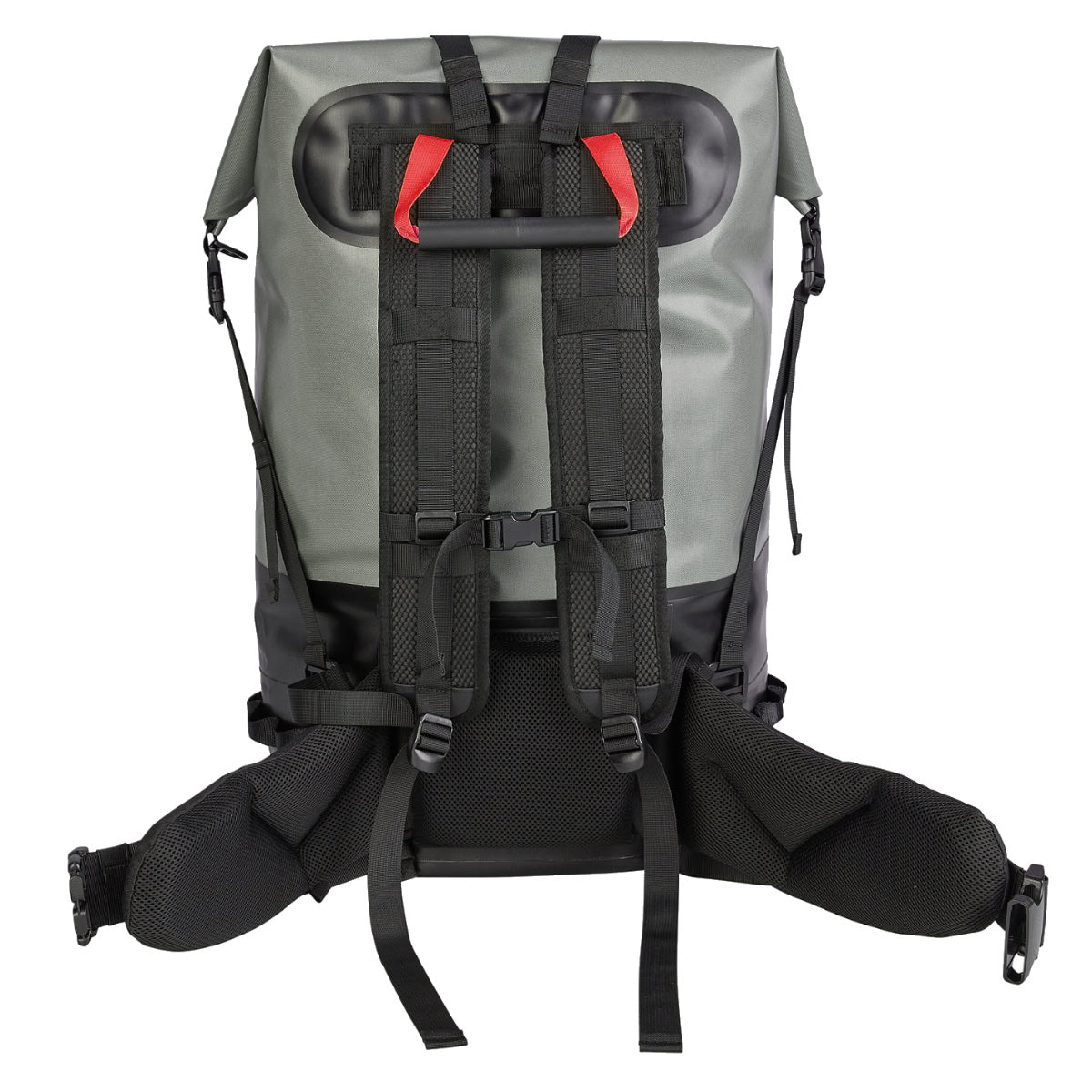 Features | Durable and waterproof polyester fabric for long-lasting use, comfort-padded shoulder straps and a sternum strap, padded waist belt, two front rubber handles for easy lifting, D-ring for attaching extra gear, Water-tight roll top closure |